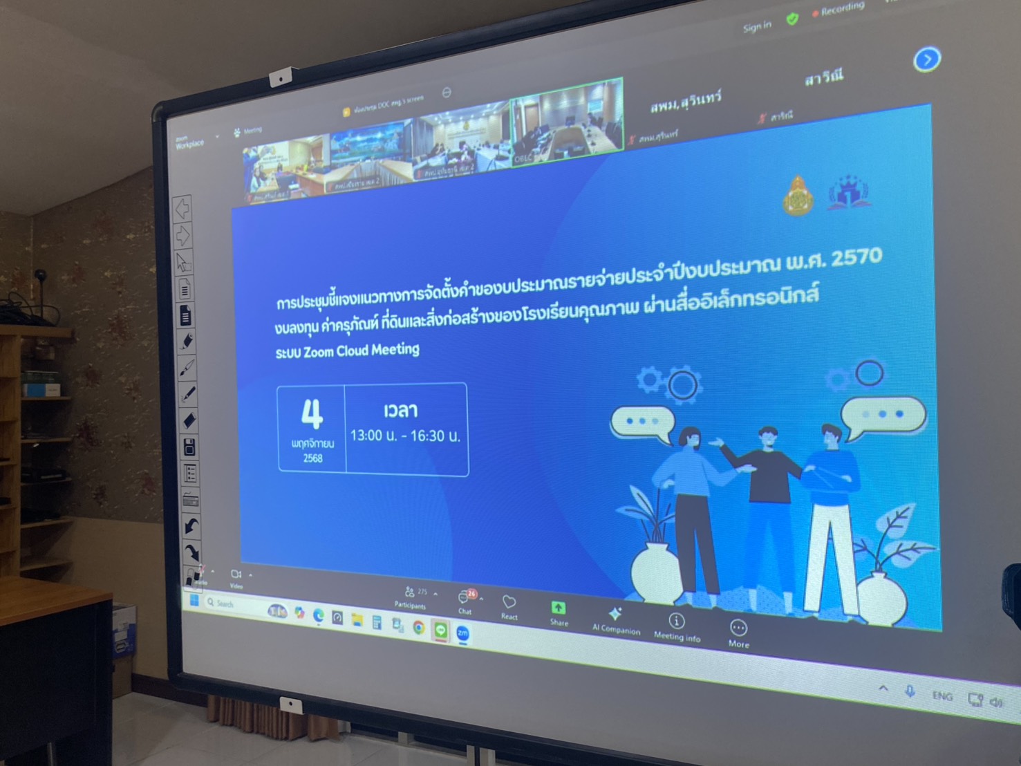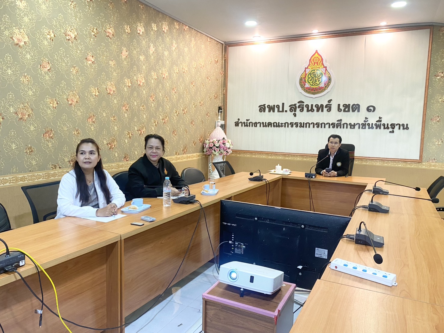 นายนาวิน ยวนจิตปิยะ รองผู้อำนวยการสำนักงานเขตพื้นที่การศึกษาประถมศึกษาสุรินทร์ เขต 1 รักษาราชการแทน ผู้อำนวยการสำนักงานเขตพื้นที่การศึกษาประถมศึกษาสุรินทร์ เขต 1 มอบหมายให้ นายพิทักษ์ ทวีแสง รอง ผอ.สพป.สุรินทร์ เขต 1 เข้าประชุมออนไลน์ในระบบ Zoom Meeting เรื่อง การจัดตั้งงบประมาณรายจ่ายประจำปีงบประมาณพ.ศ. 2570 งบลงทุนค่าครุภัณฑ์ที่ดินและสิ่งก่อสร้างของโรงเรียนคุณภาพตามนโยบาย “1 อำเภอ 1โรงเรียนคุณภาพ โดยมีนางจันทร์เพ็ญ หงษ์อินทร์ นักวิเคราะห์นโยบายและแผนรักษาการในตำแหน่งผู้อำนวยการ กลุ่มนโยบายและแผน และเจ้าหน้าที่ผู้รับผิดชอบร่วมรับฟังการประชุมในครั้งนี้ด้วย