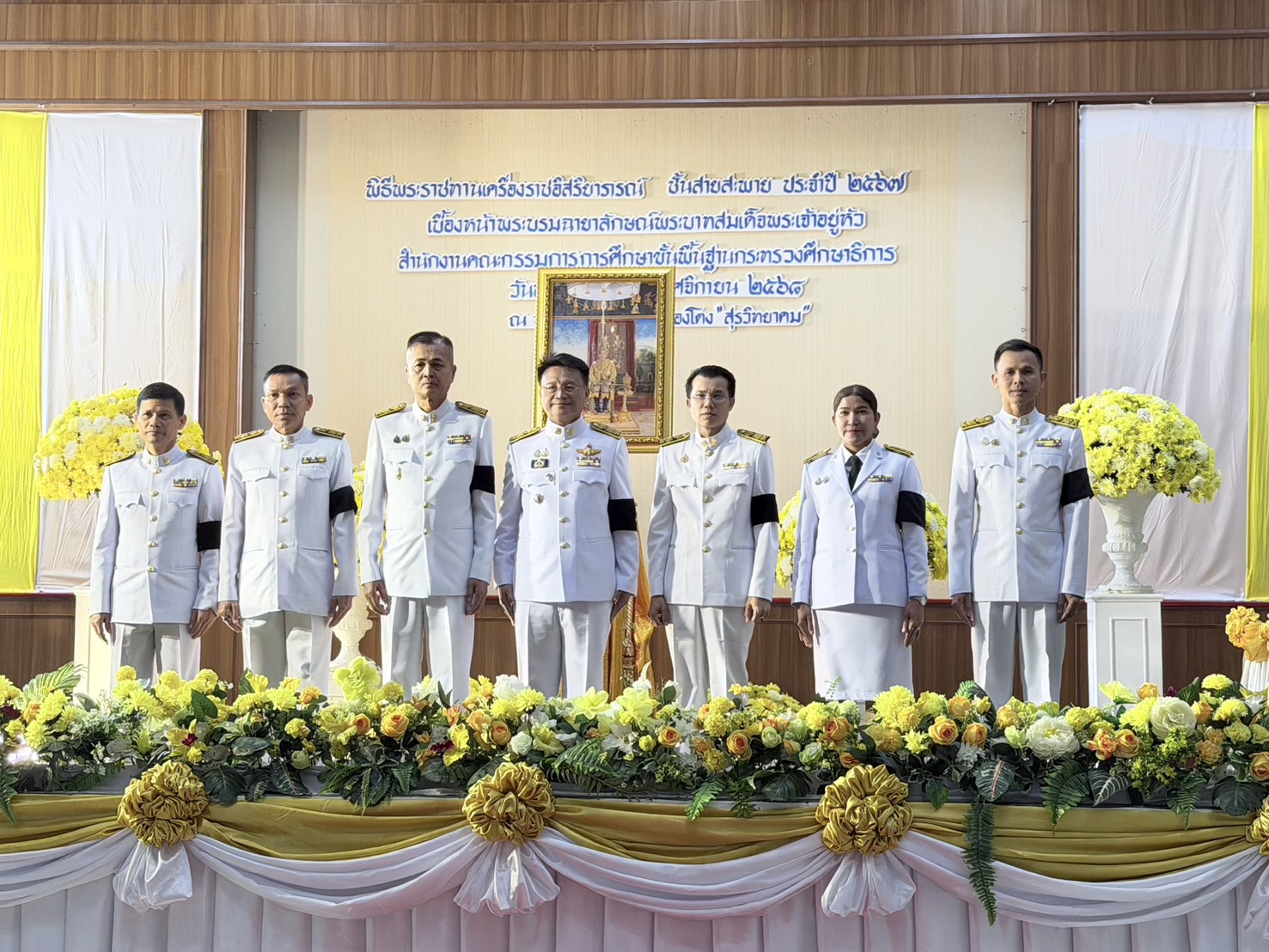 สำนักงานเขตพื้นที่การศึกษาประถมศึกษาสุรินทร์ เขต 1 จัดพิธีรับพระราชทานเครื่องราชอิสริยาภรณ์ชั้นประถมาภรณ์มงกุฎไทย (ชั้นสายสะพาย) เบื้องหน้าพระบรมฉายาลักษณ์พระบาทสมเด็จพระเจ้าอยู่หัว ประจำปี 2567