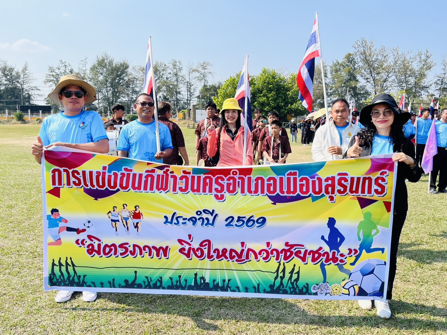 ปูนปั้น แก้วสมุทร์ 21 มกราคม 2026 ข่าวกิจกรรม วันที่ 16 มกราคม 2569 นายทวีสิทธิ์ มั่นจิต ผู้อำนวยการสำนักงานเขตพื้นที่การศึกษาประถมศึกษาสุรินทร์ เขต 1 เป็นประธานพิธีเปิดการแข่งขันกีฬางานวันครู อำเภอดมืองสุรินทร์ ประจำปี 2569 ณ สนามกีฬาโรงเรียนหนองโตง “สุรวิทยาคม” Post Views: 52 แนะแนวเรื่อง Previous Previous post: การประชุมสรุปผลการประเมินนักเรียนและสถานศึกษา เพื่อรับรางวัลพระราชทาน ระดับการศึกษาขั้นพื้นฐาน ประจำปีการศึกษา 2568Next Next post: ร่วมต้อนรับและกล่าวคำนิยม ในการตรวจเยี่ยมและประเมินพัฒนาการการบริหารจัดการด้วยระบบคุณภาพ ตามเกณฑ์รางวัลคุณภาพแห่งสำนักงานคณะกรรมการการศึกษาขั้นพื้นฐาน(OBECQA) ระดับ ScQA